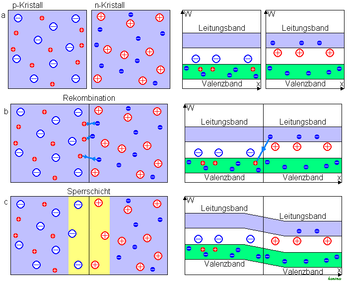 Es soll zunächst die Situation ohne äußere Spannung betrachtet werden (vergleiche Abbildung 8). Auf der n-dotierte Seite werden sich bei Raumtemperatur viele frei beweglichen Elektronen lösen und Akzeptoren ortsfest hinterlassen. Gleiches ist auf der p-dotierten Seite zu sehen: die frei beweglichen Löcher hinterlassen Donatoren. in der Mitte, am pn-Übergang, treffen beide bewegliche Ladungsträger, Elektronen und Löcher, aufeinander. Beim direkten Aufeinandertreffen werden beide Ladungsträger sich aufheben, sie rekombinieren. Dabei entsteht ein Photon (elektromagnetische Schwingung) und/oder ein Phonon (Gitterschwingung). Durch die Rekombination bildet sich eine Schicht, die Sperrschicht, welche weitgehend frei von freien beweglichen Ladungsträgern ist. Die Sperrschicht wirkt zunächst als Isolator.